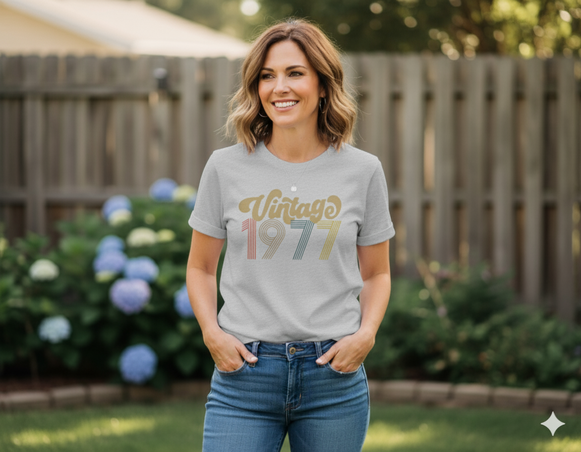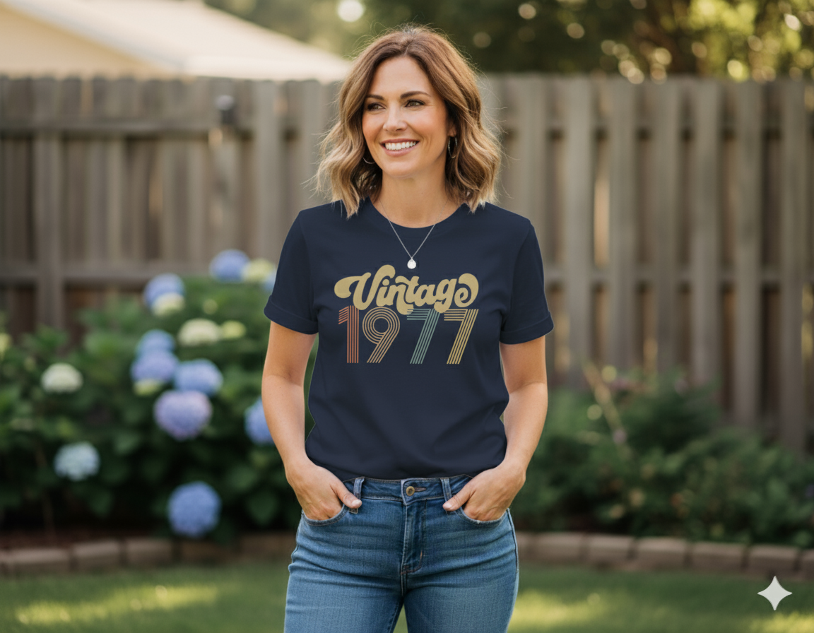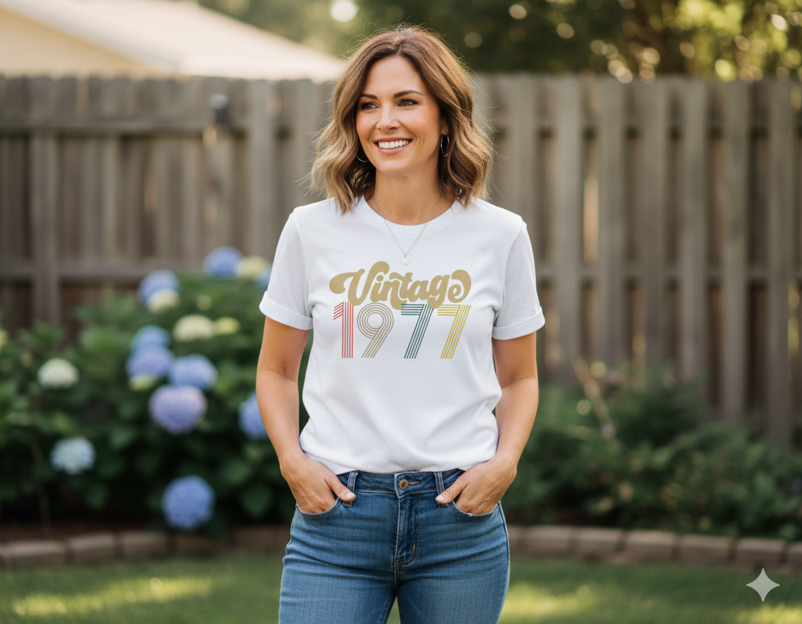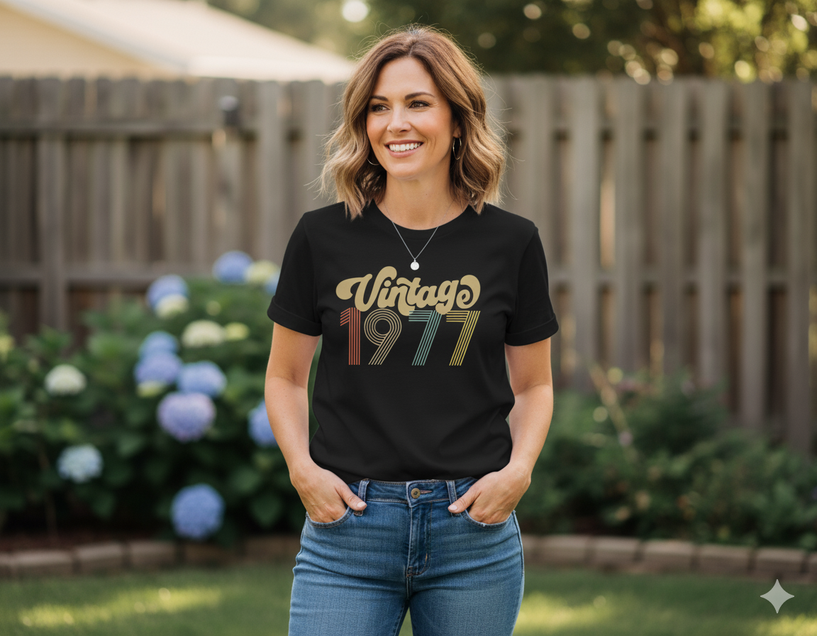 - 1977's vintage t-shirt with original lettering print, for a birthday gift.