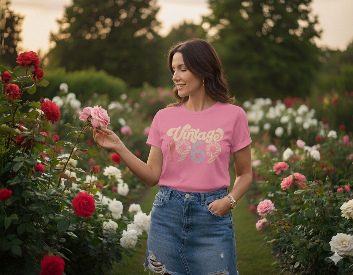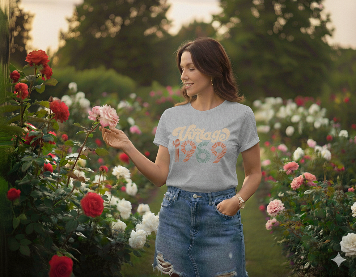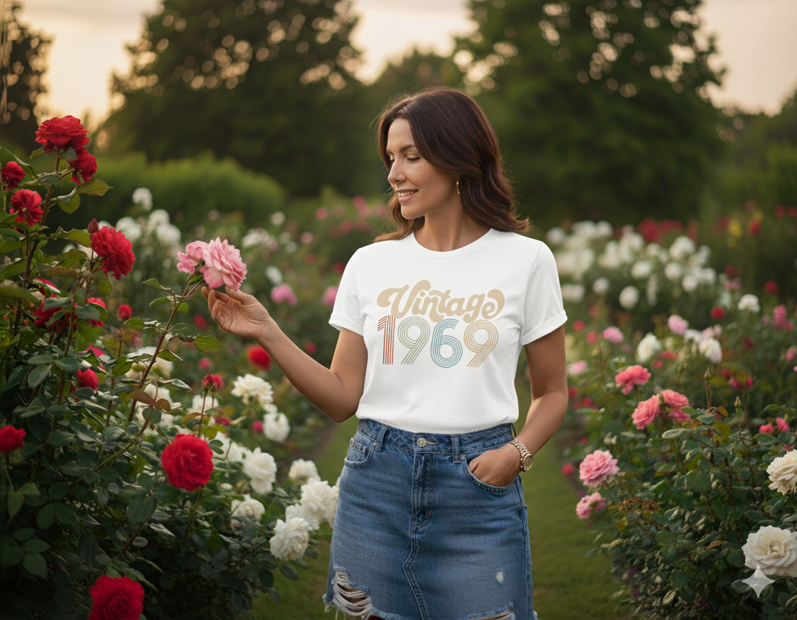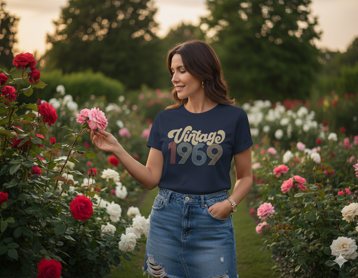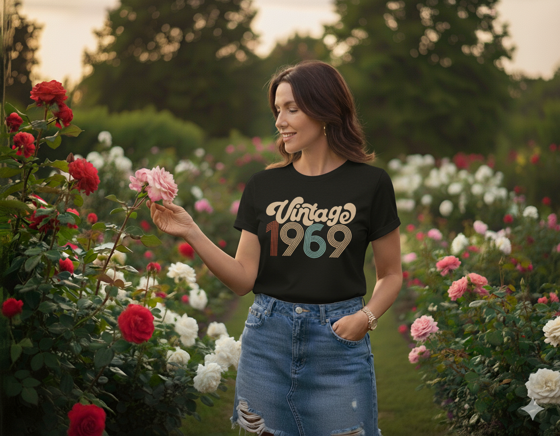 - 1969's vintage t-shirt with original lettering print, for a birthday gift.